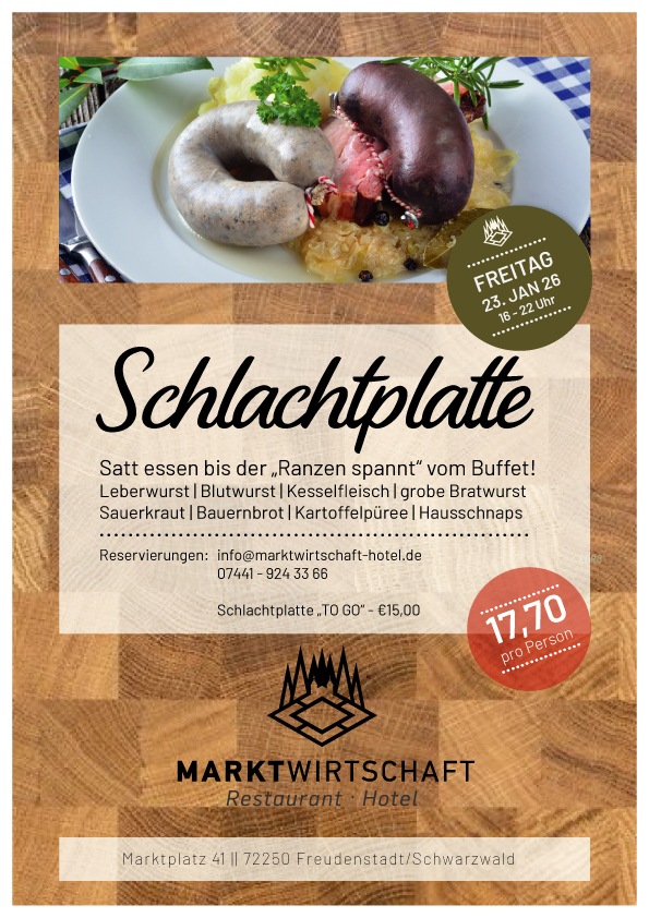 Erleben Sie die echte Schwarzwälder Gastlichkeit – bei uns in der Marktwirtschaft. Ein Ort zum glücklich sein. Das gemütliche, moderne Ambiente im Zusammenspiel mit unserer regionalen Küche sind die Grundlage für die Qualität unseres Hauses. Wir verwöhnen Sie im Herzen von Freudenstadt.